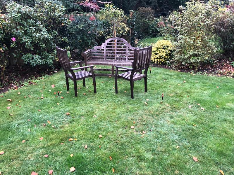 A dedicated square seating area was constructed in the middle of the lawn to create a separate garden feature. This area was also laid in Camel Dust sandstone and finished with a charcoal border to match the main patio.