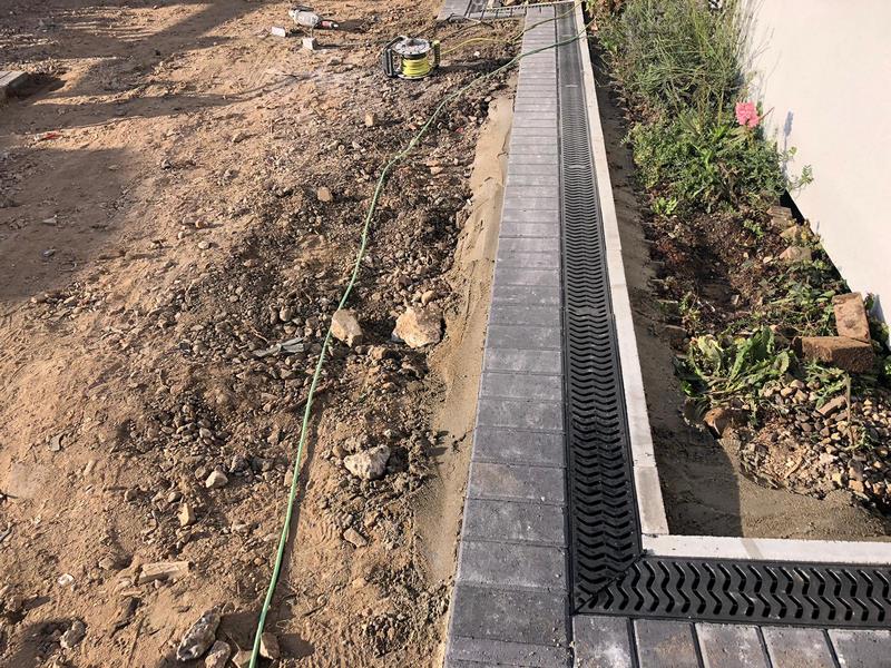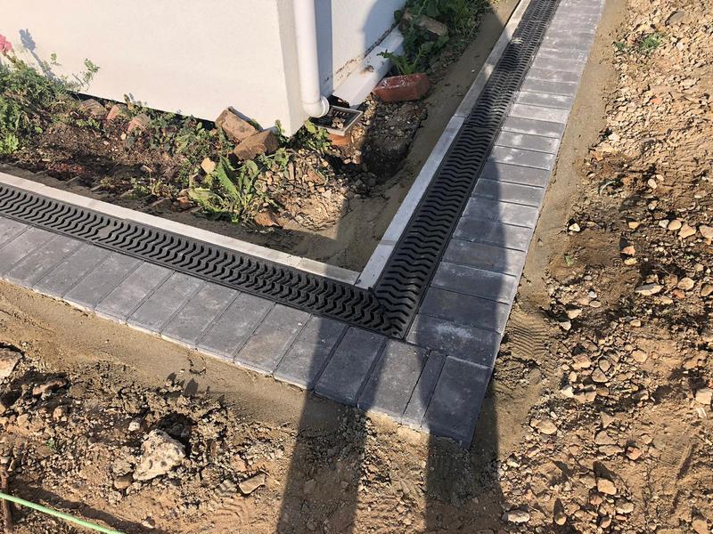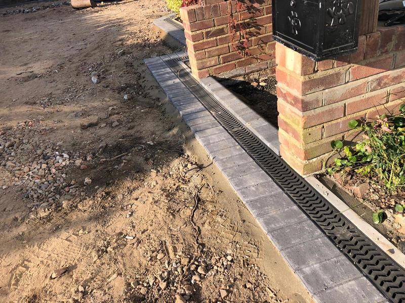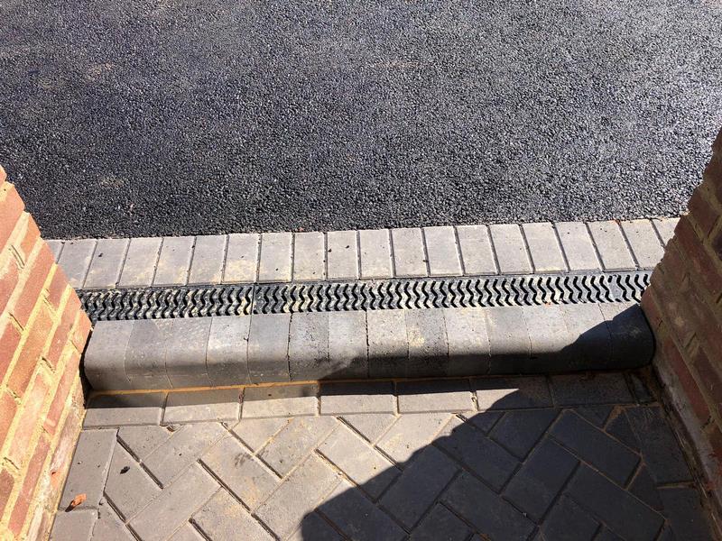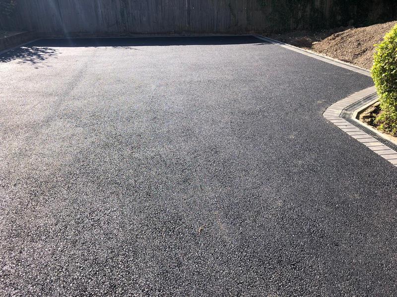 Edging & Drainage Installation: With the ground cleared, we installed a charcoal block paved border around the entire perimeter. This not only creates a decorative frame but also acts as a retaining edge for the new tarmac. A new ACO drainage channel was also installed along the side of the house to ensure that any surface water is efficiently carried away, preventing any future water damage.
